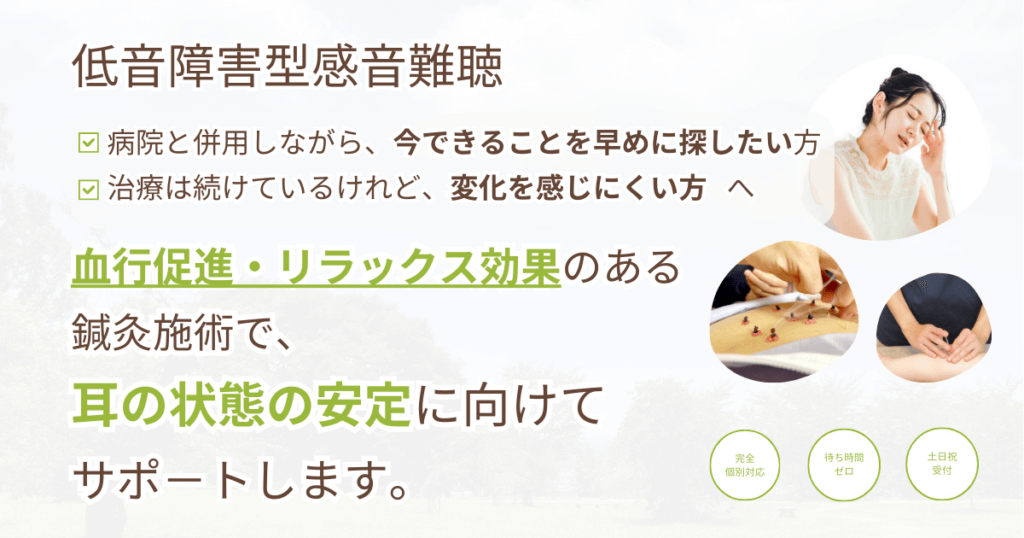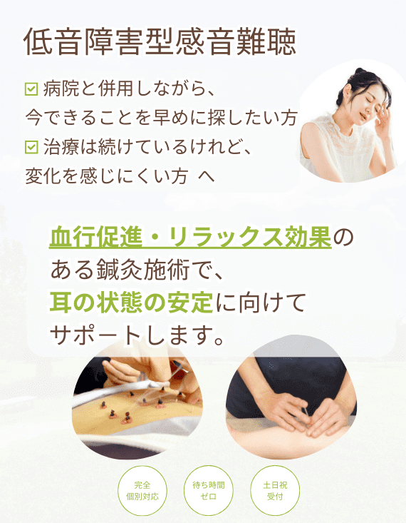 来院1週間前、耳の詰まりと音が響く感じがして、音が聞こえなくなったため、耳鼻科を受診。低音の聴力低下があり、低音障害型感音難聴と診断された。服薬で音の響きは減ったが、聴力は変わらず、病院の治療と併用してできるものを探し、お灸はり院 ともるにお問い合わせ。