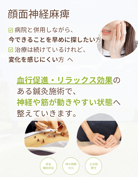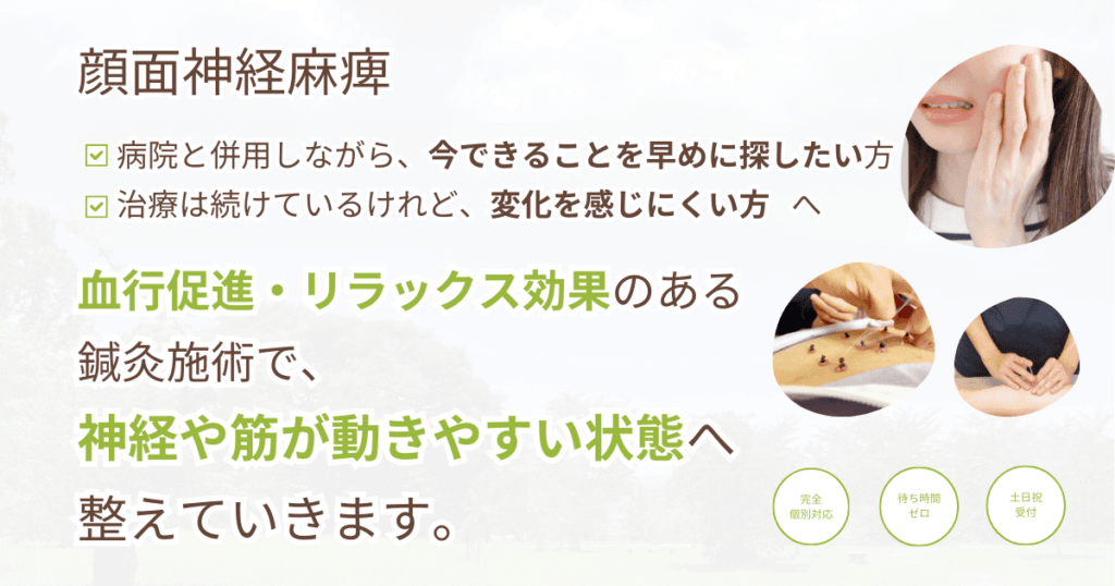 血流改善やリラックス効果が期待できるお灸や鍼で、首肩こりや背中の張りを緩和し、顔面部の血行を促すことで、顔面神経麻痺の改善に向けてお力になれる可能性があります。